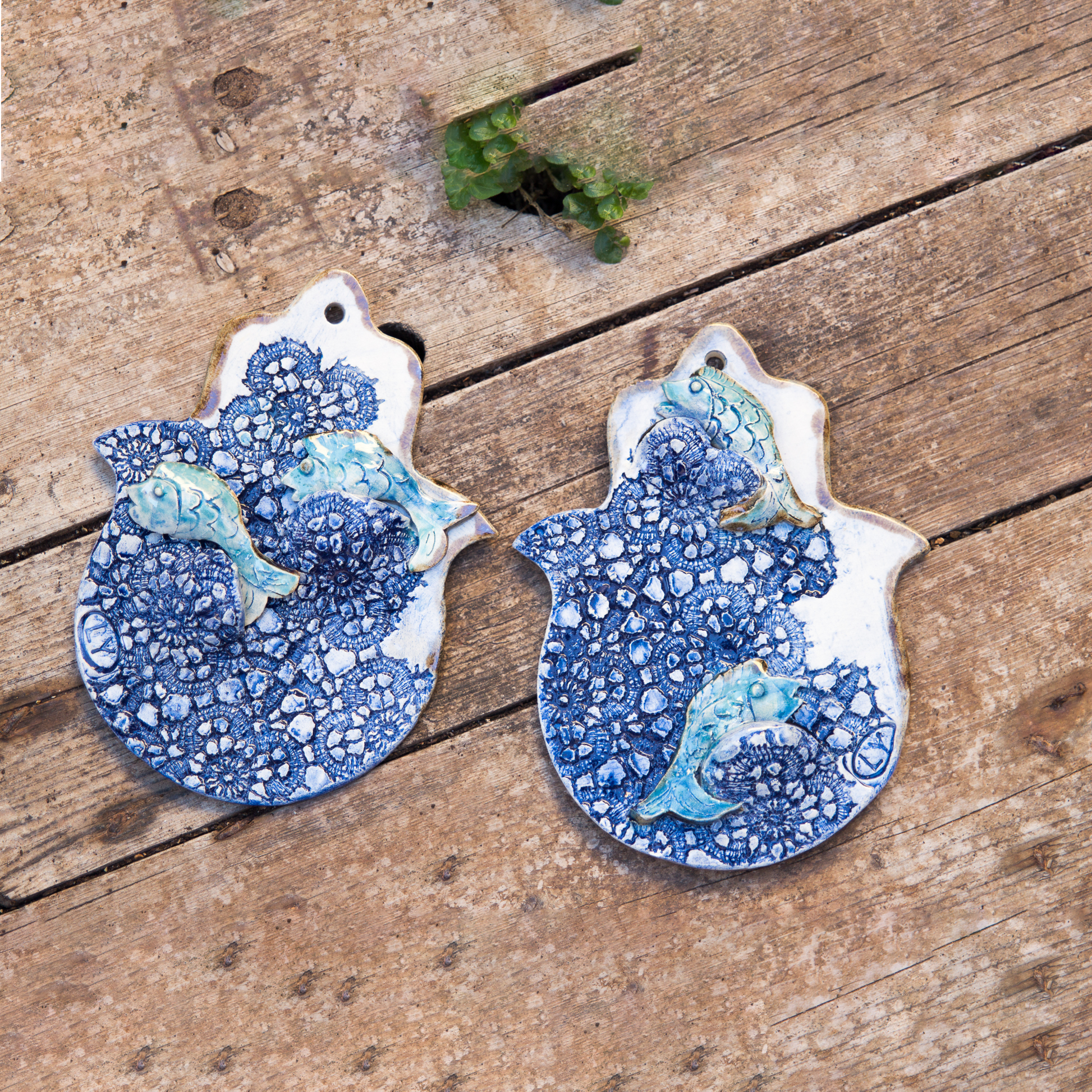 Bring a sense of protection, beauty, and tradition into your home with these stunning handmade ceramic Hamsas. Decorated with intricate blue lace patterns and adorned with delicate fish sculptures, each Hamsa combines symbolism and artistry. The fish, a timeless representation of abundance and blessings in many cultures, swims harmoniously within the elegant lace design, adding depth and charm to this unique piece.